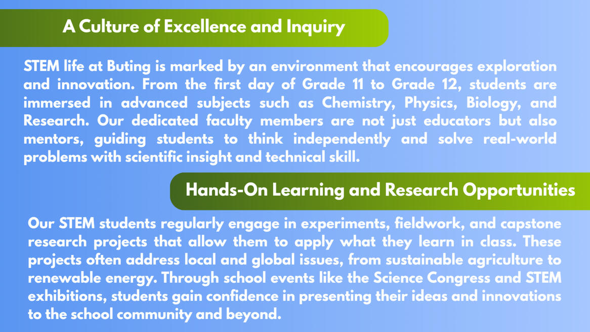At Buting Senior High School, the Science, Technology, Engineering, and Mathematics (STEM) strand is more than just an academic track โ itโs a thriving community of future innovators, critical thinkers, and passionate learners. Through a balanced blend of theoretical knowledge and practical application, STEM students at Buting SHS are equipped with the tools they need to shape tomorrowโs world.